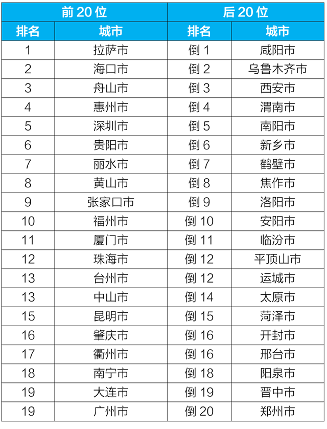 4月,168個重點城市中,??凇⒗_和舟山市等20個城市空氣質(zhì)量相對較好(從第1名至第20名);鶴壁、保定和新鄉(xiāng)市等20個城市空氣質(zhì)量相對較差(從倒數(shù)第1名至并列倒數(shù)第19名),見附表1。