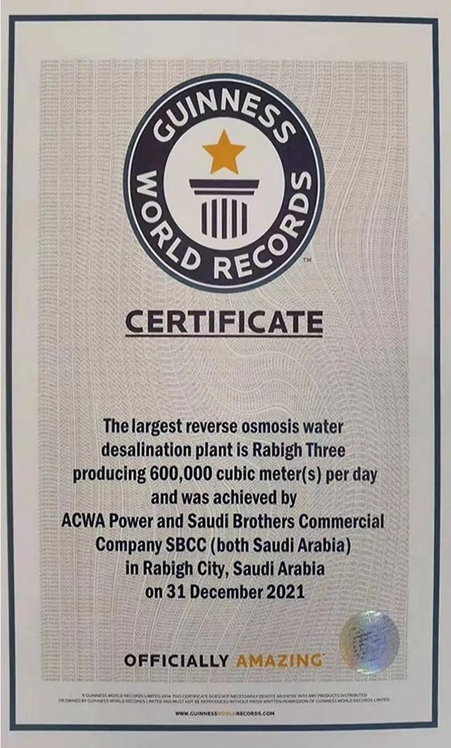 該項(xiàng)目位于沙特拉比格市,于去年12月,提前合同工期2個(gè)月投產(chǎn)。采用先進(jìn)的反滲透技術(shù),日產(chǎn)水量60萬(wàn)立方米,每天可向吉達(dá)、麥加等沙特主要城市200多萬(wàn)戶居民和朝圣者提供基本生活用水,甘甜的淡水不僅滋養(yǎng)了穆斯林圣地,還促進(jìn)了社會(huì)和旅游業(yè)發(fā)展。就在前不久,它還收到吉尼斯世界紀(jì)錄證書,成為世界最大單體反滲透海水淡化項(xiàng)目。