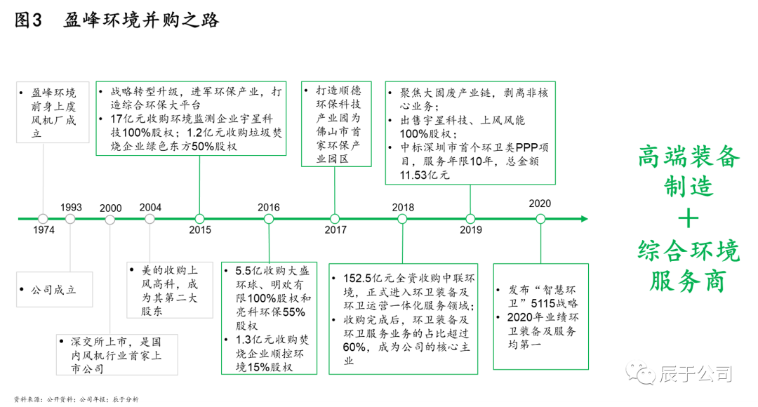 為加速轉(zhuǎn)型,作為“門外漢”的盈峰環(huán)境通過(guò)并購(gòu)切入環(huán)保市場(chǎng),先后收購(gòu)宇星科技、綠色東方、大盛環(huán)球、亮科環(huán)保、順控環(huán)境等,致力于打造成為“高端裝備制造+綜合環(huán)境服務(wù)商”(見圖3)。