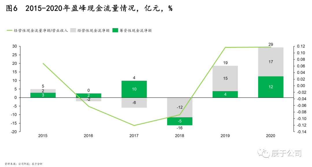 快速調(diào)整的“有進(jìn)有退”策略不僅讓盈峰環(huán)境的主業(yè)更加突出,也改善了盈峰環(huán)境的經(jīng)營(yíng)性現(xiàn)金流狀況,近兩年經(jīng)營(yíng)性現(xiàn)金流及其與營(yíng)收的比值扭虧為盈,增長(zhǎng)顯著(見圖5、圖6)。