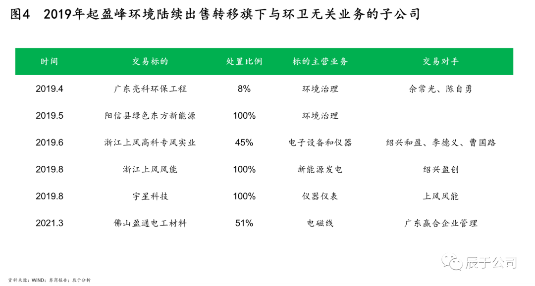另一方面果斷剝離非環(huán)衛(wèi)相關(guān)業(yè)務(wù)。2019年起,盈峰環(huán)境陸續(xù)出售轉(zhuǎn)移旗下與環(huán)衛(wèi)無(wú)關(guān)業(yè)務(wù)的子公司,剝離的主要對(duì)象為低利潤(rùn)或者邊緣業(yè)務(wù),如電磁線業(yè)務(wù)利潤(rùn)率低,風(fēng)機(jī)與環(huán)境治理業(yè)務(wù)市場(chǎng)占有率低,行業(yè)地位低,都不利于公司主業(yè)競(jìng)爭(zhēng)力的提升;剝離的主要方式為剝離公司而非業(yè)務(wù),以環(huán)境監(jiān)測(cè)業(yè)務(wù)為例,雖然宇星科技被剝離,但是雙方明確五年內(nèi),乙方、標(biāo)的公司及宇星科技不得從事環(huán)境監(jiān)測(cè)業(yè)務(wù),宇星科技相關(guān)無(wú)形資產(chǎn)授權(quán)盈峰使用,不影響公司相關(guān)業(yè)務(wù)繼續(xù)拓展(見圖4)。
