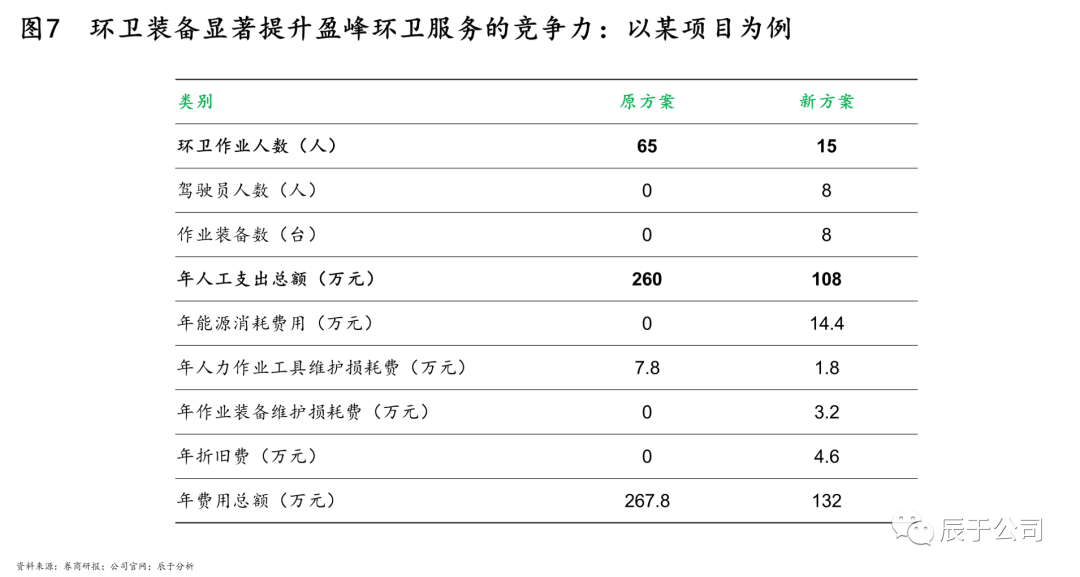 一方面,通過(guò)自有環(huán)衛(wèi)裝備優(yōu)勢(shì)強(qiáng)化環(huán)衛(wèi)服務(wù)拿單能力。以某項(xiàng)目為例,傳統(tǒng)環(huán)衛(wèi)項(xiàng)目方案年費(fèi)用總額為267.8萬(wàn)元,相比之下,盈峰涉及的機(jī)械化新方案僅為132萬(wàn)元,年度總費(fèi)用投入消減50.7%,作業(yè)人員隊(duì)伍精簡(jiǎn)64.6%(見圖7)。