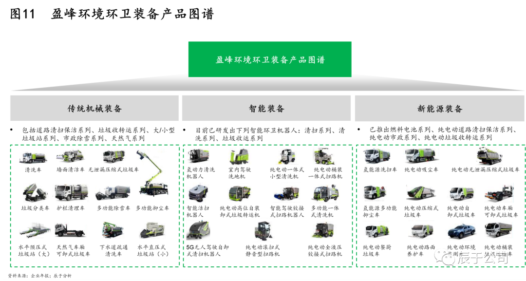 以此為基,盈峰環(huán)境進(jìn)一步聚焦機(jī)械化、智慧化、新能源化三大方向,構(gòu)建了完整的環(huán)衛(wèi)裝備圖譜,涵蓋傳統(tǒng)機(jī)械裝備、智能裝備以及新能源裝備等三大領(lǐng)域(見圖11)。