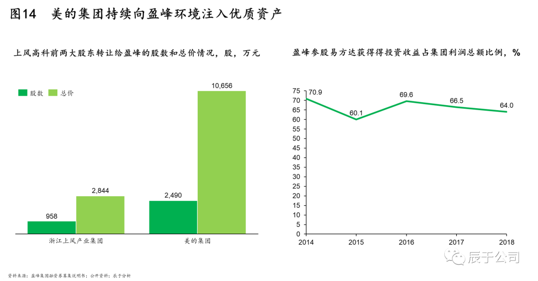 三是資本運(yùn)作方面。美的集團(tuán)持續(xù)多年向盈峰環(huán)境注入旗下優(yōu)質(zhì)資產(chǎn),為盈峰早期的規(guī)模擴(kuò)張?zhí)峁┝舜罅χС帧H?006年2月,上風(fēng)高科前兩大股東浙江上風(fēng)產(chǎn)業(yè)集團(tuán)及美的集團(tuán)將其各自持有公司的法人股轉(zhuǎn)讓給盈峰集團(tuán),從每股價(jià)格來(lái)看,在入主兩年多后,美的集團(tuán)僅僅按原價(jià)轉(zhuǎn)讓,并沒取得投資收益,可謂原價(jià)轉(zhuǎn)手;而對(duì)于盈峰而言,這是其體系內(nèi)的首家上市公司,為公司未來(lái)發(fā)展發(fā)揮了至關(guān)重要的作用。又如2007年4月,美的以1.65億元的價(jià)格向盈峰集團(tuán)轉(zhuǎn)讓易方達(dá)基金25%股權(quán),易方達(dá)成為盈峰金融板塊的主要成員,自此,盈峰從易方達(dá)獲得的投資收益多年來(lái)占到公司利潤(rùn)總額的60%以上(見圖14)。