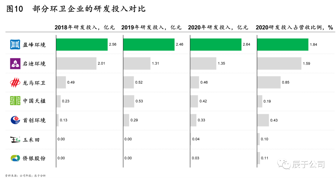 相比其他競(jìng)爭(zhēng)對(duì)手,盈峰環(huán)境在研發(fā)上的投入明顯更大,2018-2020年的研發(fā)投入絕對(duì)值一直遙遙領(lǐng)先其他企業(yè),研發(fā)投入占營(yíng)收比例也明顯更高(見圖10)。