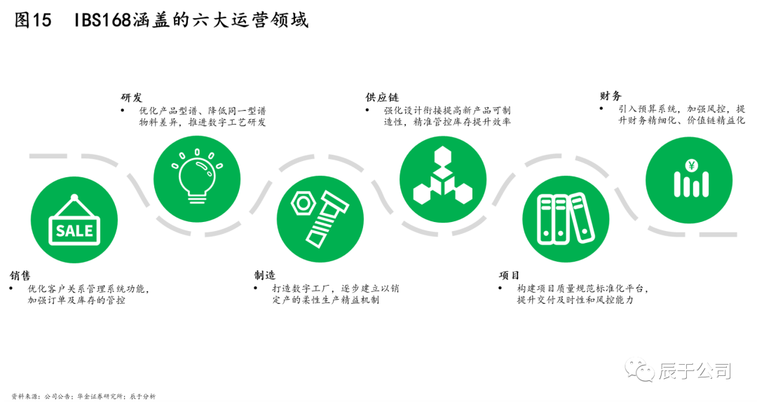 四是管理賦能方面。美的不斷將自身在家電領(lǐng)域的豐富經(jīng)驗(yàn)賦能給盈峰環(huán)境,例如,盈峰環(huán)境2019年提出IBS168計(jì)劃,正是以美的水準(zhǔn)打造的數(shù)字化管理系統(tǒng)。該系統(tǒng)的IBS指Infore Business System,構(gòu)建了以市場(chǎng)、客戶為導(dǎo)向的新型訂單預(yù)定模式,建立了內(nèi)外協(xié)同價(jià)值鏈的運(yùn)營(yíng)體系,覆蓋研發(fā)、營(yíng)銷、供應(yīng)鏈、財(cái)務(wù)、項(xiàng)目、服務(wù)6大運(yùn)營(yíng)領(lǐng)域(見圖15),包含產(chǎn)品生命周期、客戶關(guān)系、供應(yīng)商關(guān)系、制造執(zhí)行、企業(yè)資源、設(shè)備管理、組織管理、彈性制造8大管理體系。系統(tǒng)的目的是推動(dòng)全業(yè)務(wù)的數(shù)字化轉(zhuǎn)型,通過(guò)建立數(shù)字化精益制造管理體系,達(dá)到產(chǎn)銷、產(chǎn)研的高效對(duì)接并實(shí)現(xiàn)降本增效,應(yīng)用于盈峰的環(huán)衛(wèi)裝備、環(huán)衛(wèi)服務(wù)和其他固廢等業(yè)務(wù)。