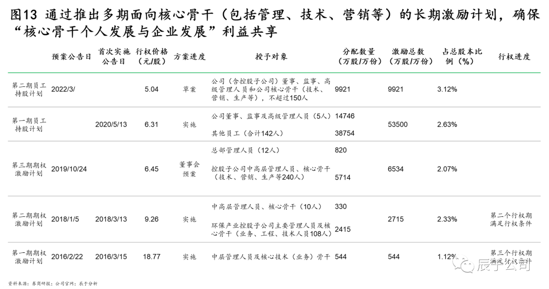 二是政策機(jī)制支持方面。盈峰環(huán)境引入美的經(jīng)驗(yàn),通過(guò)推出多期面向核心骨干(包括管理、技術(shù)、營(yíng)銷等)的長(zhǎng)期激勵(lì)計(jì)劃,確?!昂诵墓歉蓚€(gè)人發(fā)展與企業(yè)發(fā)展”利益共享(見圖13)。