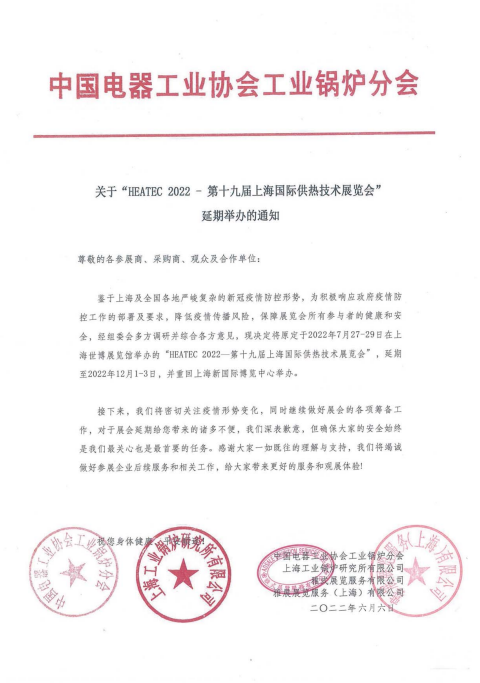 關(guān)于“HEATEC 2022—第十九屆上海國(guó)際供熱技術(shù)展覽會(huì)”延期舉辦的通知