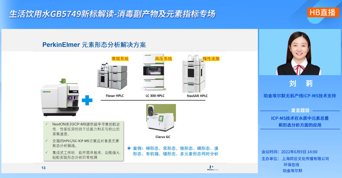 珀金埃爾默無機(jī)產(chǎn)線ICP-MS技術(shù)支持劉莉介紹了ICP-MS技術(shù)在水質(zhì)檢測(cè)方面的應(yīng)用,劉莉從GB 5749和GB 5750的變化展開,介紹了GB5749與舊版相比更新的內(nèi)容,新標(biāo)準(zhǔn)的水質(zhì)指標(biāo)由106項(xiàng)調(diào)整為97項(xiàng),水質(zhì)參考指標(biāo)由28項(xiàng)增加到55項(xiàng)。隨后劉莉介紹了針對(duì)ICP-MS技術(shù)在水質(zhì)中元素總量和形態(tài)分析方面珀金埃爾默的特色方案,如智能電子稀釋技術(shù)。隨后,劉莉介紹了GB 5750元素分析最大變化——增加元素形態(tài)分析方法,珀金埃爾默在元素形態(tài)分析方面也有著豐富的解決方案。NexION系列ICP-MS提供超常的穩(wěn)定性,性能優(yōu)異的抗干擾能力和出色的采集速度;全面的HPLC/GC ICP-MS方案應(yīng)對(duì)各類元素形態(tài)分析挑戰(zhàn);集成式工作站,軟件簡(jiǎn)單易用、功能強(qiáng)大,輕松實(shí)現(xiàn)形態(tài)分析日常檢測(cè)。