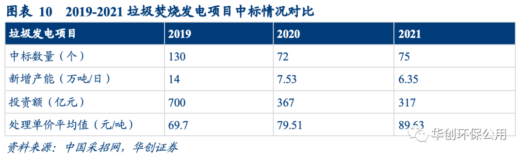 垃圾焚燒新訂單釋放速度減緩、處理費價格提升。2021年垃圾焚燒新增體量進一步下降,全年中標(biāo)項目總處理規(guī)模達6.35萬噸/日,同比2020年下降15.67%。與此同時,2021年平均中標(biāo)處理單價為89.63元/噸,同比2020 年增長12.73%。近三年以來中標(biāo)價一直維持快速上升態(tài)勢,疊加政策推動,我們認(rèn)為未來很可能按照“產(chǎn)生者付費”原則,實施居民處理費,健全收費機制,垃圾處理費單價有望進一步提升,降低對補貼依賴程度。
