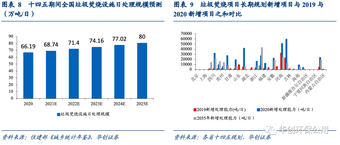 垃圾焚燒設(shè)施日處理規(guī)模超預(yù)期。根據(jù)2020城鄉(xiāng)統(tǒng)計年鑒的數(shù)據(jù),截至2020年底,我國垃圾焚燒設(shè)施的日處理規(guī)模(城鎮(zhèn)+縣城)合計已達到66.19萬噸/日,超額完成了十三五規(guī)劃58萬噸/日的目標(biāo)。