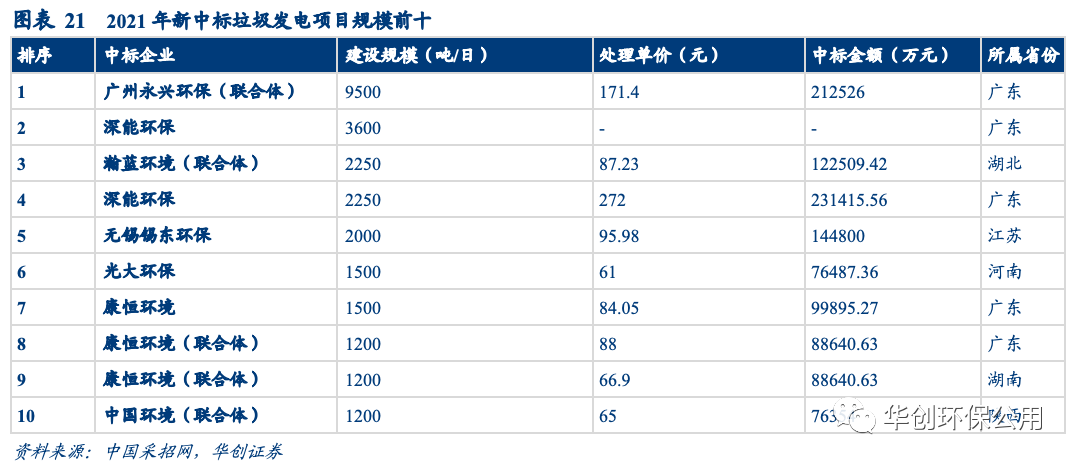 產(chǎn)能視角:行業(yè)步入成熟期,馬太效應(yīng)明顯。據(jù)不完全統(tǒng)計,2022年1-4月垃圾焚燒新中標(biāo)項目數(shù)量較去年同期有所提升,但訂單的釋放省份多數(shù)位于中部地區(qū),日處理量超過1000噸僅3個,故新增產(chǎn)能和投資額同比分別下滑;后補貼時代,新中標(biāo)的垃圾焚燒發(fā)電項目噸垃圾處置費上浮明顯,較2021年平均79.72元/噸增長20.21%。高質(zhì)量項目中標(biāo)企業(yè)以頭部公司為主,鮮有小公司的身影出現(xiàn),行業(yè)馬太效應(yīng)繼續(xù)增強。