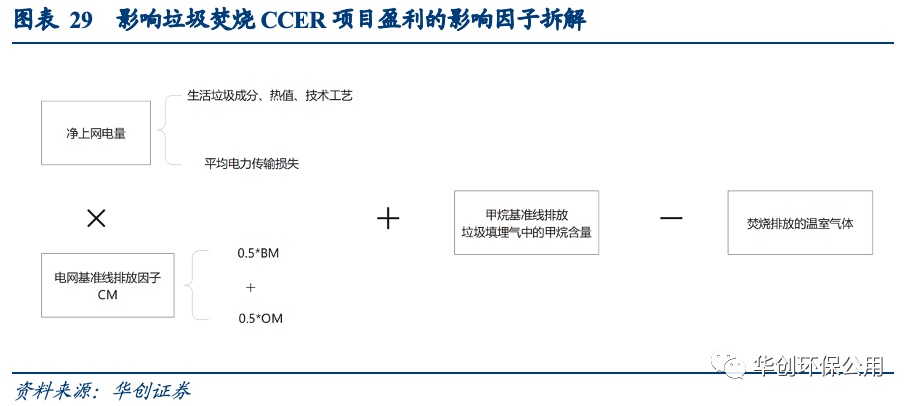 CM-072-V01“多選垃圾處理方式”(第一版)中詳細規(guī)定了測算一個垃圾焚燒項目所產(chǎn)生的CCER噸數(shù)的方法學(xué)。與可再生能源發(fā)電項目相比,垃圾焚燒發(fā)電項目不僅替代了項目所在地電網(wǎng)的火力發(fā)電的碳排放,還避免了垃圾填埋產(chǎn)生的甲烷排放;但焚燒化石燃料也會帶來一定的溫室氣體排放。