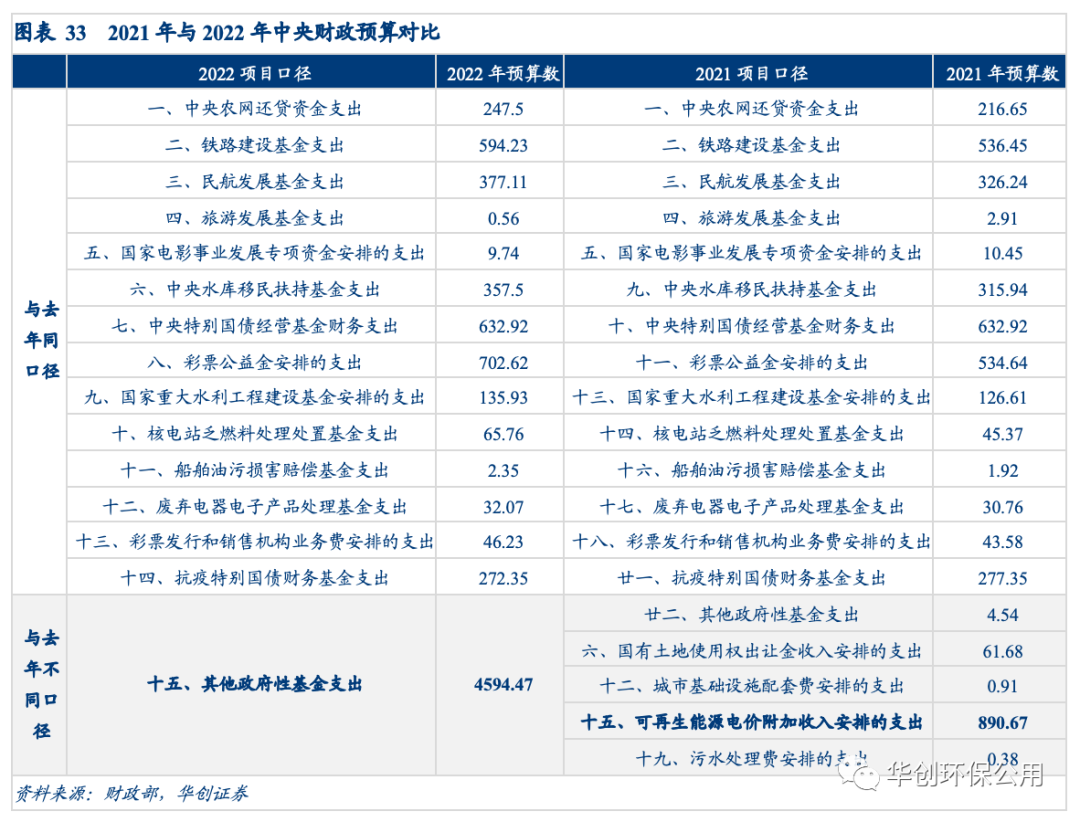 22年政府預(yù)算支出中有4500億元的補貼增量或?qū)⒂糜诳稍偕茉囱a貼的一次性發(fā)放。2022年與2021年中央財政預(yù)算支出的口徑發(fā)生了變化,其中21年出現(xiàn)的“可再生能源電價附加收入安排的支出”科目在22年的財政支出預(yù)算中消失,22年的統(tǒng)計口徑中其他政府性基金支出項目由21年的4.54億元驟增至4594.47億元??紤]到22年將21年的若干個口徑進行合并,假設(shè)除可再生能源補貼項目的其他合并項目預(yù)算支出保持不變,預(yù)計今年將能騰挪出4500億元的財政支出供可再生能源補貼的發(fā)放,此前的拖欠問題有望得到一次性解決。