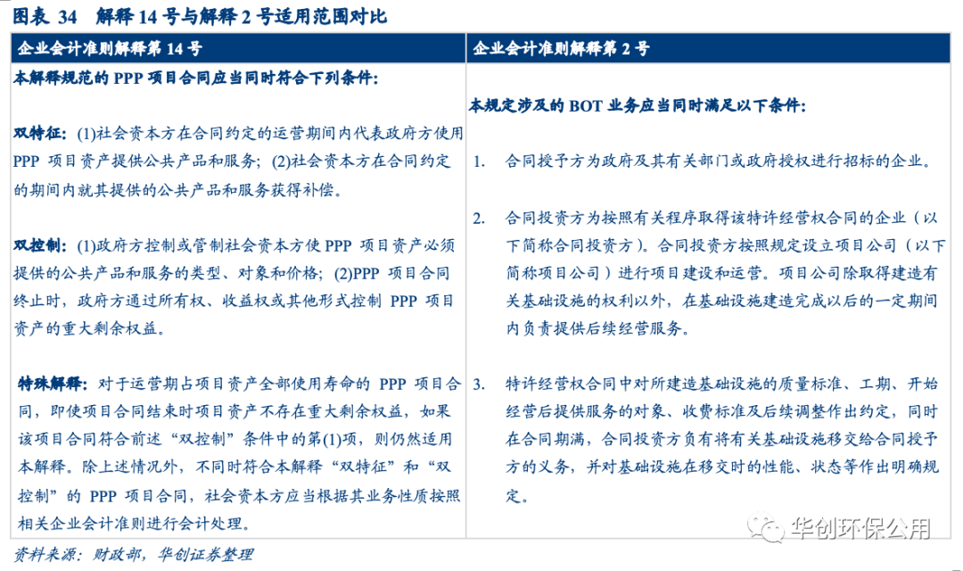 解釋14號對適用范圍做出了更詳細的說明,應(yīng)當(dāng)符合“雙控制”與“雙特征”。解釋2號僅對“合同授予方”、“合同投資方”、“特許經(jīng)營權(quán)”等關(guān)鍵名詞做出解釋而解釋14號則對適用范圍做出明確說明——滿足“雙控制”與“雙特征”條件,并對運營期占項目資產(chǎn)全部使用壽命項目、不符合“雙控制”與“雙特征”條件項目的處理方法做出解釋。