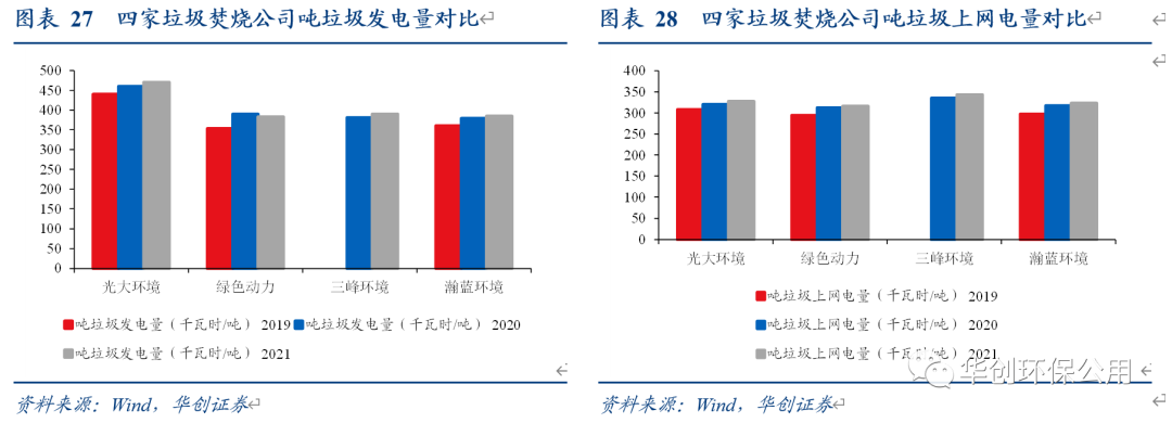 我們選取光大環(huán)境、三峰環(huán)境、瀚藍環(huán)境和綠色動力四家上市公司進行比較,所有公司的2019-2021年的噸垃圾發(fā)電量與噸垃圾上網(wǎng)電量均呈現(xiàn)上升趨勢。2021年光大環(huán)境的噸垃圾發(fā)電量已達到470度,大幅領(lǐng)先其余公司;噸上網(wǎng)電量四家公司差距不大,均在320-340度這一區(qū)間。我們認(rèn)為噸垃圾發(fā)電量的逐年提升亦可以增厚垃圾焚燒項目的盈利能力,削弱國補退坡的不利影響。