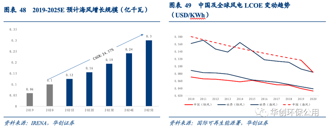 海上風(fēng)電增長空間巨大,平價節(jié)點或?qū)⒂瓉硌b機潮。海上風(fēng)電“十四五”期間預(yù)計新增裝機200GW,20-25年CAGR約25%,高于十四五期間風(fēng)電整體13.5%的增速。隨著海風(fēng)伙伴計劃首次提出海風(fēng)將于2024年實現(xiàn)平價,海風(fēng)或?qū)⒂谄絻r節(jié)點迎來裝機潮,海風(fēng)未來發(fā)展可期。