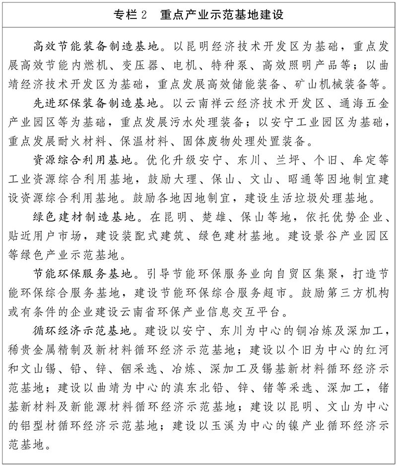 推動(dòng)昆明建設(shè)環(huán)保產(chǎn)業(yè)1園3基地。依托現(xiàn)有國(guó)家級(jí)開發(fā)區(qū),建設(shè)昆明環(huán)保產(chǎn)業(yè)科創(chuàng)園,重點(diǎn)開展環(huán)保技術(shù)研發(fā)、系統(tǒng)集成、技術(shù)成果轉(zhuǎn)化、項(xiàng)目投資等業(yè)務(wù)。依托骨干企業(yè),建設(shè)污水處理、固體廢物處理、生活垃圾處理、工業(yè)煙氣處理、環(huán)境監(jiān)測(cè)儀器等環(huán)保裝備制造基地,打造高效節(jié)能內(nèi)燃機(jī)、節(jié)能型變壓器、特種泵、礦山機(jī)械等節(jié)能裝備制造基地,創(chuàng)建裝配式建筑部品部件、節(jié)能玻璃、節(jié)能環(huán)保面板、新型墻體材料等綠色建材制造基地。