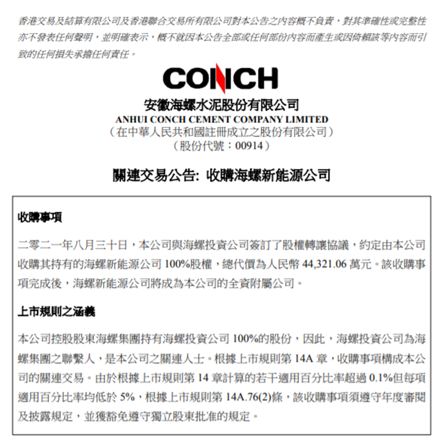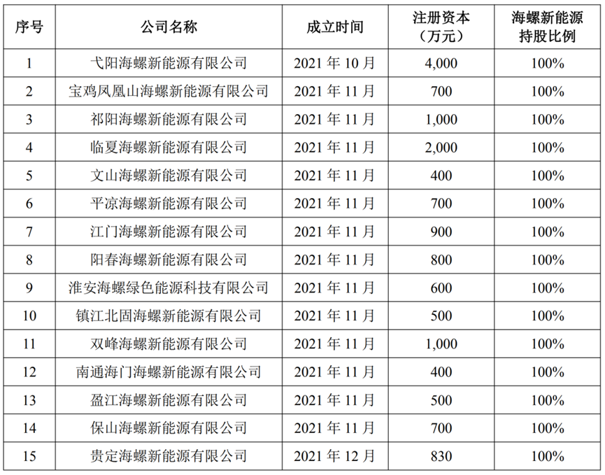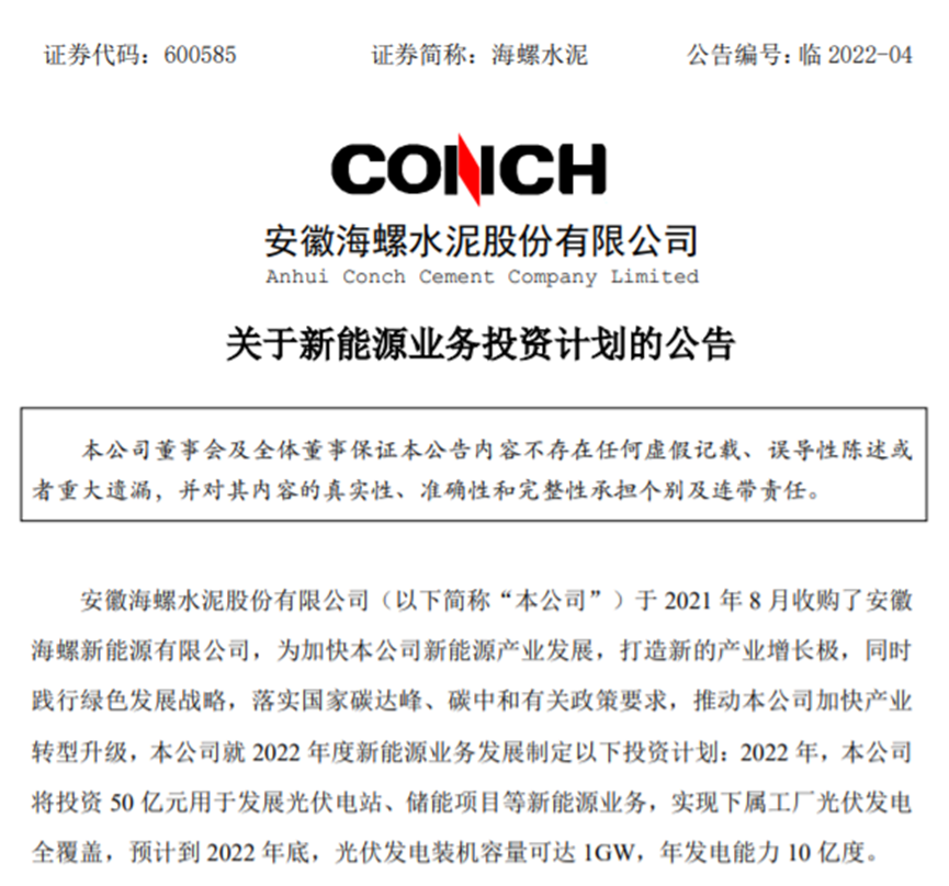 2019年至2021年,海螺水泥的營業(yè)收入分別為1570億元、1763億元、1680億元,同比增長分別為22.3%、12.27%、-4.73%;歸屬凈利潤分別為335.9億元、351.6億元、332.7億元,同比增長分別為12.67%、4.66%、-5.38%。在“碳達峰、碳中和”的大背景下,海螺集團不斷加碼固廢處理、新能源建設(shè)等領(lǐng)域。王誠自接任董事長以來便加快踐行綠色新能源轉(zhuǎn)型發(fā)展,同時與多個城市簽署戰(zhàn)略合作、框架合作等協(xié)議。在新能源領(lǐng)域,2021年8月,海螺水泥收購了海螺新能源,海螺新能源成為其全資子公司,進一步加快海螺水泥聚焦發(fā)展光伏電站、儲能項目等新能源業(yè)務(wù)。收購?fù)瓿珊?,?jù)海螺水泥2021年年報顯示,2021年10月至12月短短三個月時間,海螺新能源獨立出資設(shè)立了15家新能源公司。