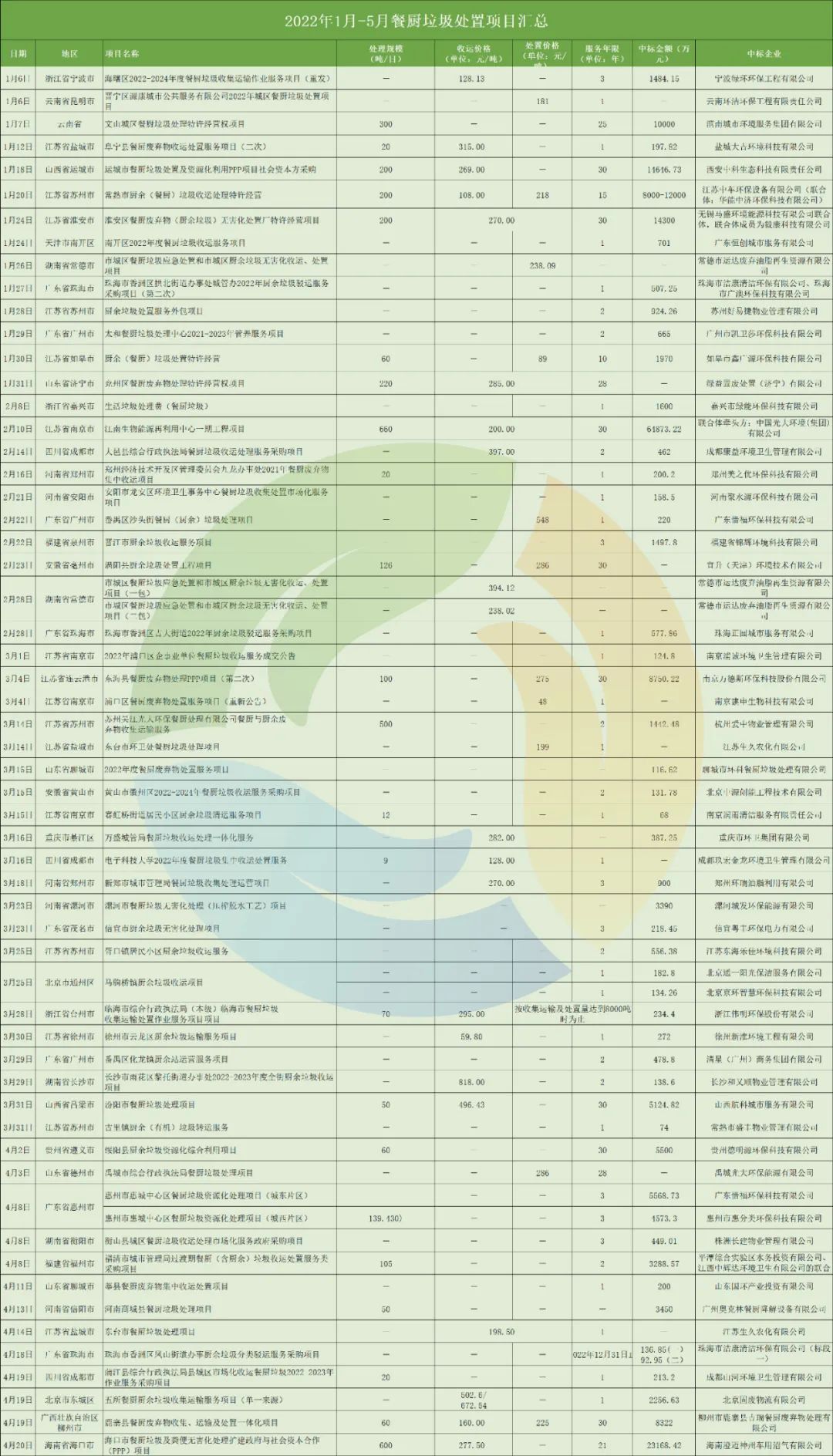 此外,在統(tǒng)計數(shù)據(jù)中,我們還可以發(fā)現(xiàn)本地國企中標趨勢明顯增強。例如,宜昌建投水務有限公司中標了1.6億的宜昌市廚余垃圾資源化處理特許經(jīng)營權項目,眉山市城投中恒能環(huán)??萍加邢薰緞t中標了1.1億眉山市餐廚垃圾綜合利用項目。近年來,不少企業(yè)憑借自身優(yōu)勢與政府簽訂了餐廚垃圾/廚余垃圾項目單一來源采購協(xié)議。其中,北京固廢物流有限公司就以單一來源的方式拿下了2256萬的北京市東城區(qū)五所餐廚廚余垃圾收集運輸服務項目。這類項目最大特點就是只有一家供應商,不存在競爭。不過,在2021年發(fā)布的97個餐廚/廚余垃圾項目中,有18個項目為單一來源方式,占比18.56%,其中多以收運處理一體化項目為主。今年單一來源方式采購項目明顯減少。而隨著垃圾焚燒項目“降溫”,龍頭企業(yè)布局餐廚垃圾市場的步伐也逐漸加快。2022年1-5月,光大環(huán)境共中標3個餐廚垃圾處理項目,拿標數(shù)量位居中標企業(yè)第一位,項目總預算金額超6億元(2021年同期,光大環(huán)境拿下3個項目,拿標數(shù)量位居中標企業(yè)第一位)。從不久前發(fā)布的2021年光大環(huán)境年報中可以看出,餐廚垃圾處理項目為光大環(huán)境凈利潤增長助力不少。而作為環(huán)衛(wèi)市場老牌企業(yè)的盈峰環(huán)境,2019開始切入餐廚市場。去年,盈峰環(huán)境全資子公司廣東盈峰環(huán)境投資有限公司中標淮安餐廚擴建項目,該擴建項目建成后,合同總額預計73612萬元(含收轉運合同總額33236萬元)。今年,盈峰環(huán)境又拿下了2個餐廚項目,分別位于湖南、安徽、廣東三省,服務范圍已從前端環(huán)衛(wèi)項目運營到末端的餐廚垃圾處置,成為跨界經(jīng)營的典范。還有長期從事垃圾滲濾液相關裝備制造和運營業(yè)務的萬德斯,2021年計劃以2.36億的價格收購時代桃源,切入有機垃圾領域(后停止收購)。今年取得了江蘇省連云港市東海縣餐廚廢棄物處理PPP項目,處置規(guī)模為100噸/日。值得注意的是,北清環(huán)能在最近一年內累計花費8億元大規(guī)模收購餐廚項目,業(yè)務呈快速發(fā)展態(tài)勢。總體來看,我國餐廚垃圾處理行業(yè)雖然發(fā)展10年有余,但始終發(fā)展緩慢,項目和企業(yè)規(guī)模都比較小,競爭格局較為分散,目前尚沒有巨頭出現(xiàn)。不過,隨著市場逐漸釋放,單體項目的規(guī)模越來越大,未來,餐廚垃圾處理市場的巨頭或許也即將出現(xiàn),此次寶安項目可能就是轉折點。有人毛利27%,有人虧損