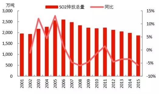 SO2的排放量為1859萬噸,每年基本以4%左右的速度下降,而收關(guān)年2015年下降速度高達5.84%;