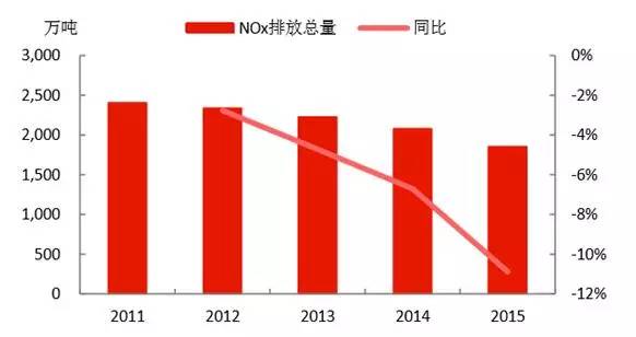 NOx的排放量為1852萬噸,“十二五”剛開始治理,當(dāng)前的下降速度還處于上升趨勢,收關(guān)年2015年下降速度高達10.89%。
