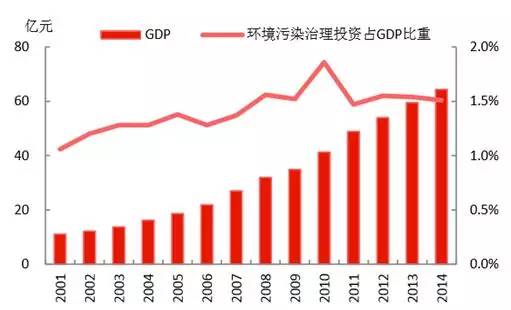 從國家統(tǒng)計局的數(shù)據(jù)可以看到,我國在環(huán)境污染治理方面的投資量,呈現(xiàn)上升趨勢,2014年達到9576億元;近年占GPD的比重維持在1.5%左右,較2001年提升約0.5個百分點。發(fā)改委、環(huán)保部印發(fā)《關(guān)于培育環(huán)境治理和生態(tài)保護市場主體的意見》,提出目標,“十三五”綠色環(huán)保產(chǎn)業(yè)產(chǎn)值年均增長15%以上,遠高于CDP的增長目標,為經(jīng)濟增長注入動力。