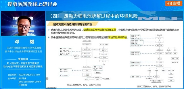 污染擔(dān)責(zé),生產(chǎn)者責(zé)任延伸,全過(guò)程監(jiān)管等新變化,鄧毅主任都一一進(jìn)行了解讀,隨后就廢動(dòng)力鋰電池回收利用的背景、行業(yè)現(xiàn)狀、資源價(jià)值、拆解過(guò)程的環(huán)境風(fēng)險(xiǎn),《廢鋰離子動(dòng)力蓄電池處理污染控制技術(shù)規(guī)范》(HJ1186-2021)等內(nèi)容進(jìn)行了梳理,同時(shí)提出了幾點(diǎn)建議。