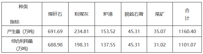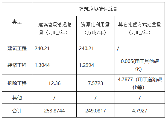 注:1.建筑工程:合計229.21萬噸,全部用于塌陷治理、路基回填、山體修復(fù)、綠化,無存量垃圾,利用率100%;
