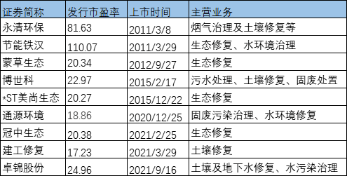 與整體市場的理性回歸相對應(yīng),環(huán)境監(jiān)測檢測和生態(tài)修復(fù)企業(yè)領(lǐng)域企業(yè)的發(fā)行市盈率也在近些年呈現(xiàn)出逐步降低的趨勢。
