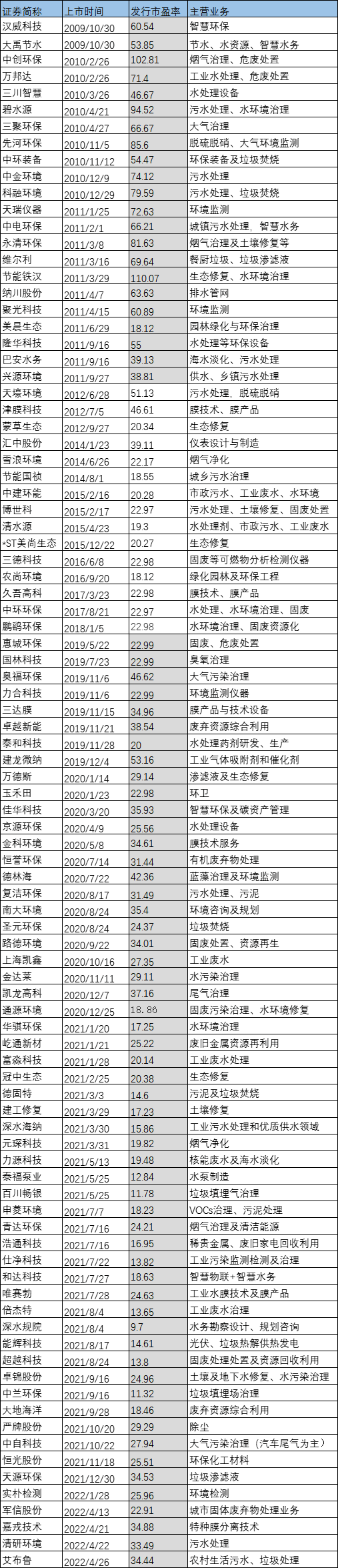 市盈率亦稱本益比,是股票價格除以每股盈利的比率。發(fā)行市盈率是指企業(yè)上市時股票發(fā)行價格與股票的每股收益的比例,可以用來反映資本對企業(yè)的價值判斷。一定程度上等同于大家俗稱的上市公司的PE值。發(fā)行市盈率高,在一定程度上反映了投資者對公司當前價值和發(fā)展?jié)摿Φ恼J同。這里作者試著從發(fā)行市盈率角度,看看這些年資本對環(huán)保企業(yè)的態(tài)度變化。