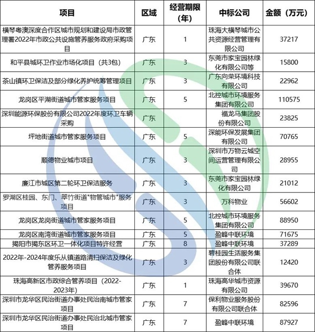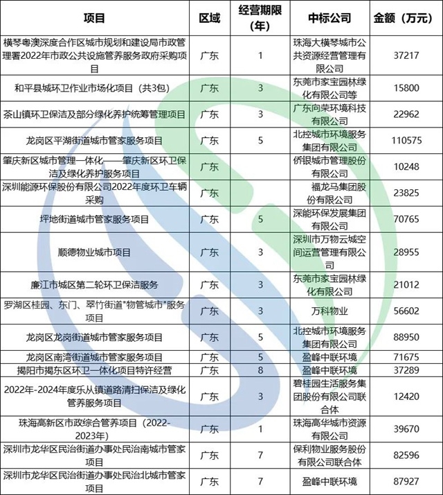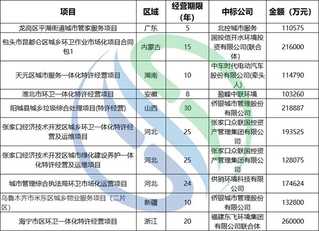東飛環(huán)境、北控城市服務(wù)等傳統(tǒng)環(huán)衛(wèi)企業(yè),上半年同樣表現(xiàn)不俗。東飛環(huán)境中標(biāo)3個億級項目,合同額31.25億,同時,東飛環(huán)境以聯(lián)合體成員身份攜手浙江海云環(huán)保中標(biāo)了上半年合同金額最高的環(huán)衛(wèi)項目,海寧市區(qū)環(huán)衛(wèi)一體化特許經(jīng)營項目,中標(biāo)價:116432911元/年,另算使用者付費:其他垃圾收集和轉(zhuǎn)運12256867元/年+糞便清運及處理有償收費773500元/年,特許經(jīng)營期年限20年,合計總金額達(dá)26億元;北控城市服務(wù)中標(biāo)4個億級項目,合同總額23.96億,包括深圳兩個街道的大管家項目,合同總額近20億。
