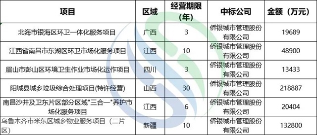 上半年,僑銀股份以6個項目,45.41億的合同排名第二!項目區(qū)域分布較為分散。目前,僑銀股份的城市大管家服務(wù)布局全國百城,標(biāo)桿項目包括合同額67億元的昆明官渡一體化PPP項目、廣州市本級環(huán)衛(wèi)一體化PPP項目等。