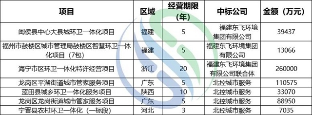 東飛環(huán)境和北控城市服務(wù)上半年億級項目中標(biāo)情況