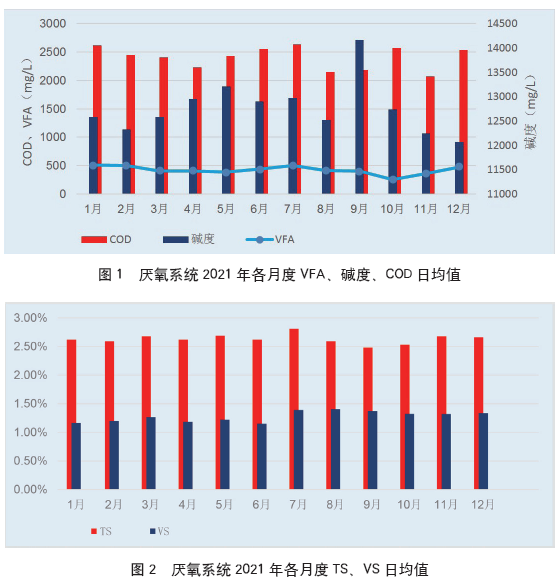 廣州福山生物質綜合處理廠厭氧系統(tǒng)2021年運行狀況見圖1、圖2。