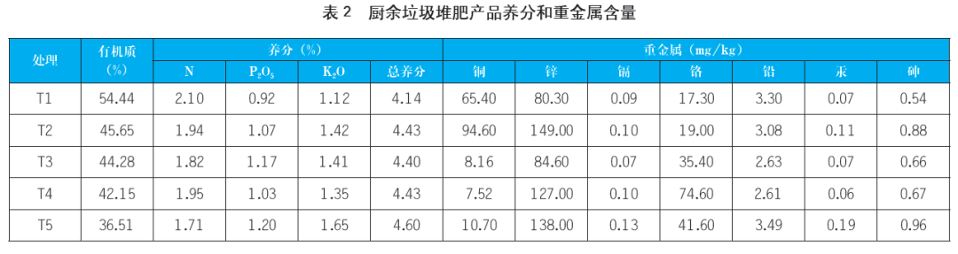 表2為各處理廚余垃圾堆肥產(chǎn)品的有機(jī)質(zhì)、養(yǎng)分和重金屬含量。在堆肥過(guò)程中,各處理有機(jī)質(zhì)含量不斷下降,但均滿(mǎn)足《有機(jī)肥料》(NY/T 525-2021)標(biāo)準(zhǔn)(有機(jī)質(zhì)含量≥30%)。由于有機(jī)物礦化會(huì)導(dǎo)致堆體體重減輕發(fā)生濃縮效應(yīng),總養(yǎng)分(以N+P2O5+K2O計(jì))含量增加,各處理含量均>4.0%,具有較高的營(yíng)養(yǎng)價(jià)值。對(duì)于各處理重金屬含量,鋅的含量最高(80.30~149.00mg/kg),其次為銅和鉻(7.52~94.60mg/kg和17.30~74.60mg/kg),再者是鉛(2.61~3.49mg/kg),鎘、汞、砷的含量保持在較低范圍(0.070~0.125mg/kg、0.061~0.187mg/kg和0.538~0.964mg/kg),遠(yuǎn)低于《有機(jī)肥料》(NY/T 525-2021)中重金屬濃度標(biāo)準(zhǔn)。