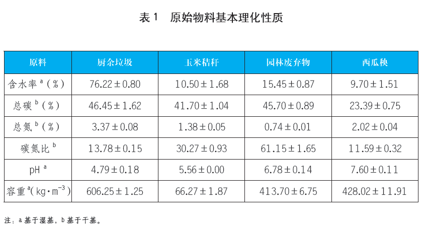 本試驗(yàn)以分類(lèi)后廚余垃圾為原料,以粒徑控制在40~50mm以下的玉米秸稈(CS)、園林剪枝(GP)和西瓜秧(WS)按一定比例混合后,作為輔料加入到廚余垃圾中進(jìn)行堆肥。其中廚余垃圾主要含有60.79%菜葉、8.96%剩飯、19.31%果皮、3.68%蛋殼、1.97%骨頭以及5.29%其他物質(zhì)(以濕重計(jì)),主要分布在<30mm粒徑段,其次為>80mm和50~60mm的較大粒徑段,其他粒徑段含量較少。堆肥原料的理化性質(zhì)如表1所示。