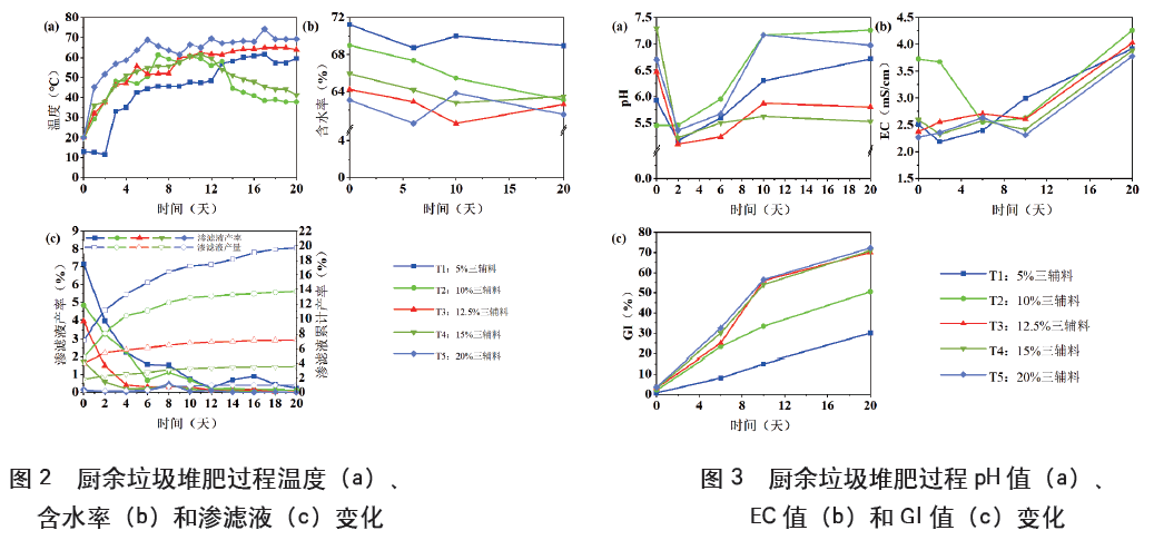 整體看來(lái),各處理含水率呈不斷下降趨勢(shì),而其他各處理含水率均低于5%三輔料處理(圖2b)。到堆肥結(jié)束時(shí),添加12.5%和20%三輔料的處理含水率最低,分別為62.62%和61.54%;5%三輔料處理含水率為68.97%。堆肥開(kāi)始時(shí),隨著輔料配比的升高,滲濾液產(chǎn)率逐漸降低,5%三輔料和20%三輔料處理差異顯著,初始產(chǎn)率分別為7.2%和0.1%(圖2c)。當(dāng)輔料添加比例由5%增至12.5%時(shí),滲濾液累計(jì)產(chǎn)率由19.7%降至7.2%;當(dāng)輔料添加比例增至20%時(shí),滲濾液累計(jì)產(chǎn)率為1.0%。由此可見(jiàn),當(dāng)輔料施用比例大于12.5%時(shí),可以顯著減少由廚余垃圾的高含水率產(chǎn)生的大量滲濾液。