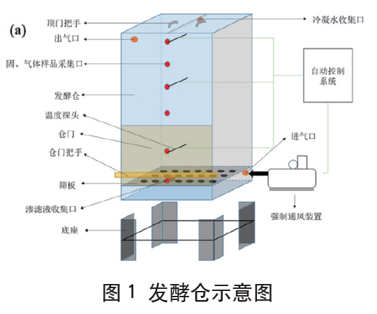 本研究采用模擬隧道發(fā)酵倉(cāng)堆肥高度的中試密閉堆肥倉(cāng)(1m×1m×3.5m)中進(jìn)行廚余垃圾堆肥試驗(yàn)。堆肥倉(cāng)配備了上、中、下三個(gè)溫度探頭,自動(dòng)控制系統(tǒng)連接溫度傳感器和通風(fēng)裝置,以實(shí)現(xiàn)溫度記錄和通風(fēng)控制,堆肥倉(cāng)示意圖如圖1所示。本試驗(yàn)根據(jù)所添加的三輔料(其中CS:GP:WS=1:1:1)比例不同,共設(shè)置5個(gè)處理過(guò)程,分別添加5%(T1)、10%(T2)、12.5%(T3)、15%(T4)和20%(T5)三輔料。此外,為緩解餐廚垃圾酸化導(dǎo)致升溫緩慢的問(wèn)題,堆肥中添加了1%(以干重計(jì))的生石灰。整個(gè)堆肥周期設(shè)為20天,其中第1~10天為高溫發(fā)酵階段,通風(fēng)速率為0.05~0.15m3/m3·min;第10~20天為后熟化階段,通風(fēng)速率為0.02m3/m3·min。在堆肥開(kāi)始后第0、2、6、10、20天,在發(fā)酵倉(cāng)的上、中、下三點(diǎn)每次分別采集約300g固體樣品用于后續(xù)指標(biāo)的測(cè)定。