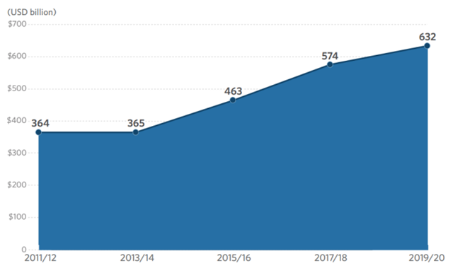 家庭支出是年度私人氣候融資的第三大份額,在2019/2020年增加到550億美元。其中,家庭在電動汽車的年度消費支出為250億美元,比2017/2018年減少50億美元,這一減少主要是由于企業(yè)改進了其購置電動汽車的相關(guān)統(tǒng)計數(shù)據(jù)。其次,小型太陽能電池板的部署達(dá)到250億美元,主要由美國和中國驅(qū)動。