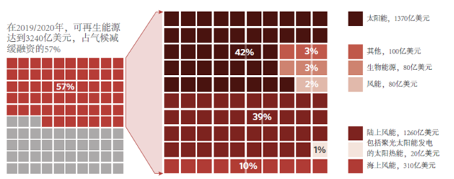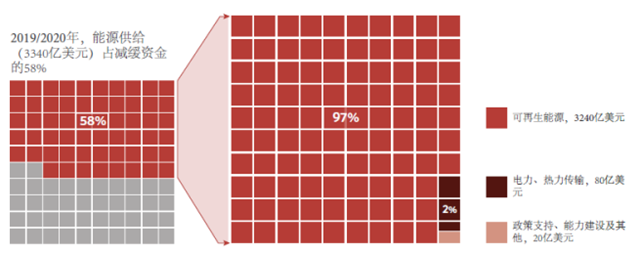 2019-2020年,90%可溯源的氣候投融資用于減緩氣候變化,平均每年達(dá)到5710億美元,比2017-2018年增加了340億美元左右。如下圖所示,減緩資金中,對于能源供給的投資是主要組成部分(3340億美元,58%),同時也占全部氣候融資資金的53%。盡管新冠肺炎疫情對全球經(jīng)濟產(chǎn)生了影響,但年平均與2017/2018年相比,2019/2020年的可再生能源投資保持穩(wěn)定,在全部能源融資資金中占比97%。值得注意的是,由于太陽能和風(fēng)能技術(shù)的成本大幅降低,同樣的投資水平可以轉(zhuǎn)化為比2017/2018年更大的新增產(chǎn)能。