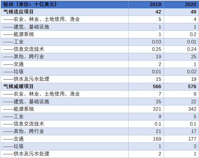 表1 2019-2020年全球氣候適應(yīng)、減緩項目投融資規(guī)模(按用途劃分)