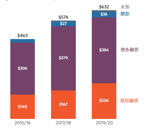 股權(quán)融資是僅次于債務(wù)融資的第二大工具類別,資金主要流向可再生能源系統(tǒng),2019/2020年,其占?xì)夂蛉谫Y總額的33%,高于前一時期的29%。其中,基于資產(chǎn)負(fù)債表的股權(quán)融資占股權(quán)融資總額的48%(1550億美元),項目股權(quán)融資占25%(510億美元)。除此之外,贈款融資于同時期達(dá)到了360億美元,占總資金流量的6%(2017/2018年為5%)。