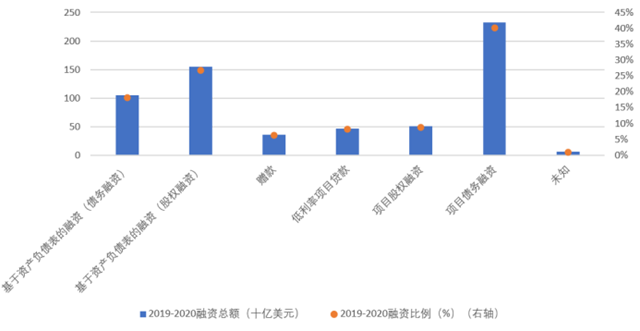 通常情況下,按照融資類型進行劃分,氣候融資工具主要包括債務(wù)融資工具、股權(quán)融資工具以及贈款,在2019/2020年度占?xì)夂蛉谫Y總量的比例分別為61%、33%及6%。