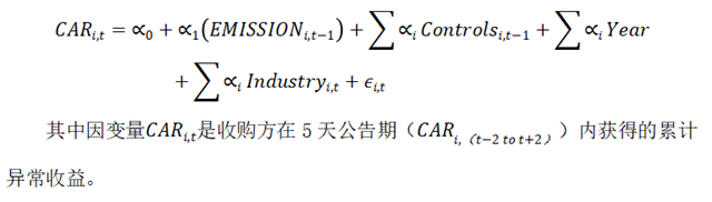 具體地,作者主要提出以下幾個(gè)問題:(1)碳風(fēng)險(xiǎn)對并購決策是否重要,尤其是跨境目標(biāo)的選擇?(2a)收購方的碳風(fēng)險(xiǎn)是否與收購公告的市場反應(yīng)有關(guān)?(2b)排放對收購公告回報(bào)的影響是否因公司的 CSR 聲譽(yù)而減弱或增強(qiáng)?