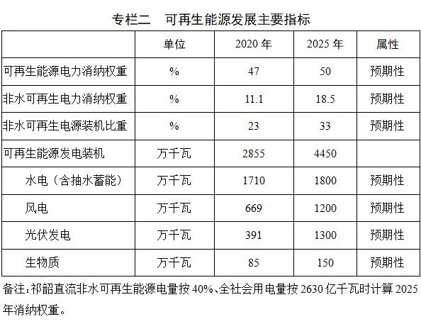 對標(biāo)國家總體目標(biāo),結(jié)合我省實際,在“十四五”期間努力實現(xiàn)可再生能源“綠色貢獻更大、利用領(lǐng)域更廣、使用成本更低、產(chǎn)業(yè)結(jié)構(gòu)更優(yōu)”的發(fā)展目標(biāo)。到2025年,可再生能源發(fā)電裝機規(guī)模達到約4450萬千瓦,其中水電1800萬千瓦,非水可再生能源2650萬千瓦,全省可再生能源電力消納責(zé)任權(quán)重穩(wěn)定在50%左右,非水可再生能源電力消納責(zé)任權(quán)重達到18.5%左右,非化石能源消費占一次能源消費總量的22%以上。