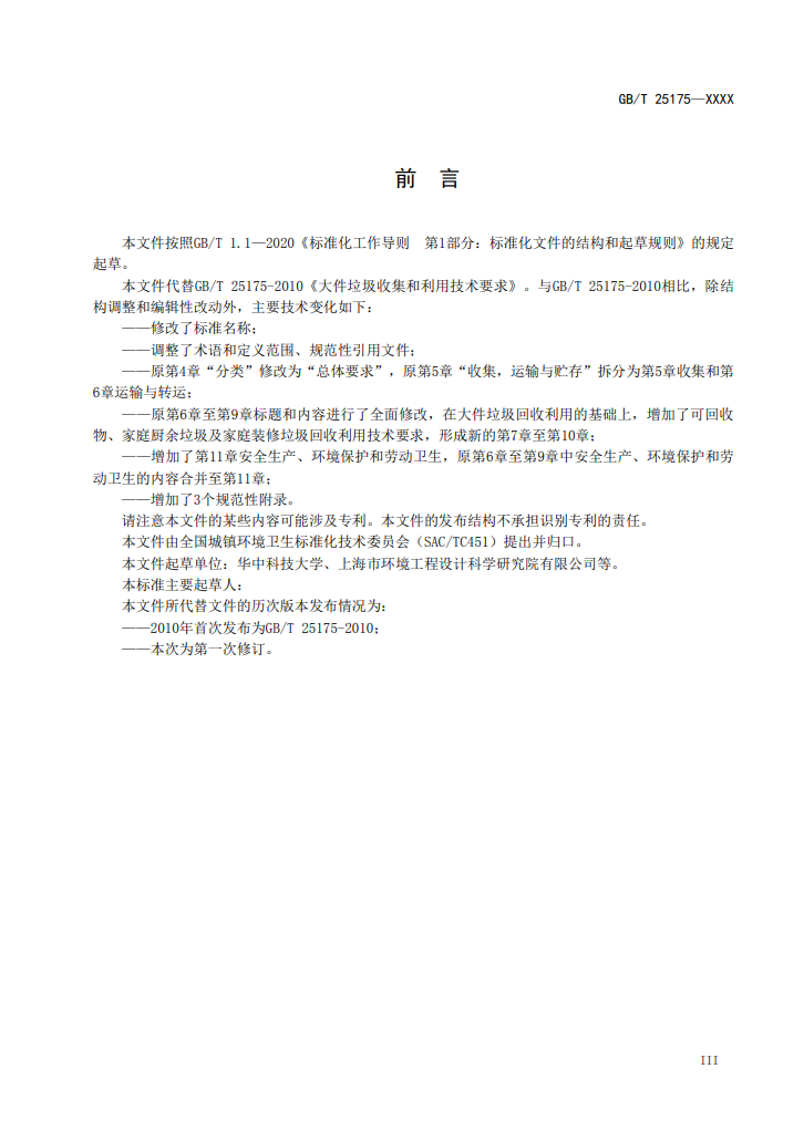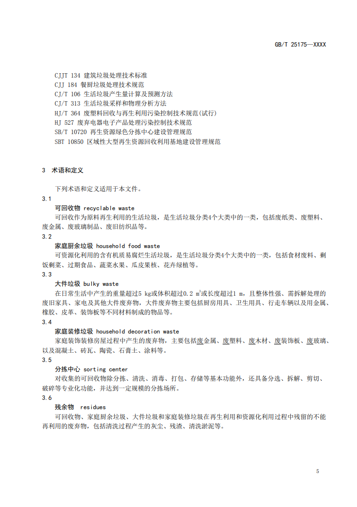 由于標(biāo)準(zhǔn)系由大件垃圾國(guó)標(biāo)修訂而來(lái),因此首先在術(shù)語(yǔ)部分進(jìn)行了修改,對(duì)“可回收物”、“家庭廚余垃圾”、“大件垃圾”、“家庭裝修垃圾”、“分揀中心”和“殘余物”六項(xiàng)做出定義。
