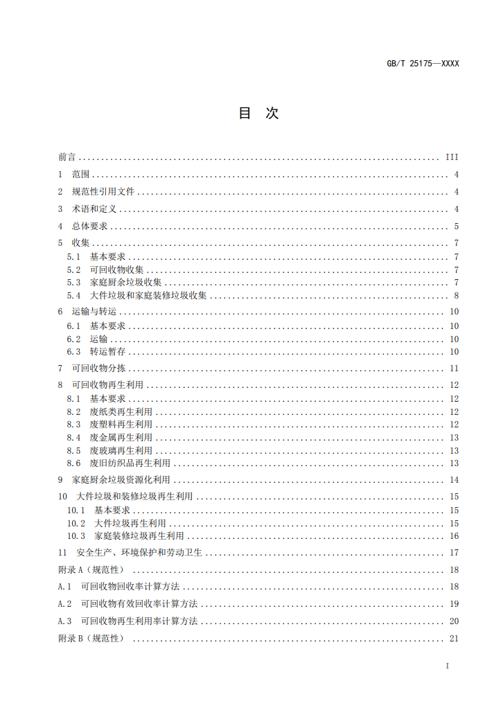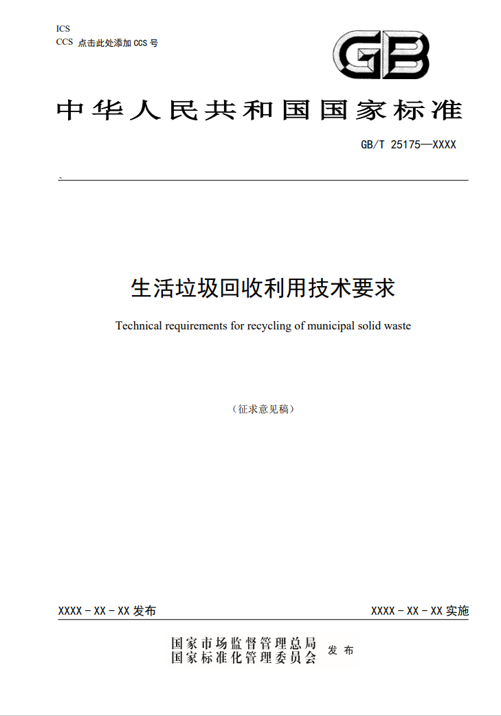 另外標(biāo)準(zhǔn)還對(duì)生活垃圾回收利用過(guò)程中的安全生產(chǎn)、環(huán)境保護(hù)和勞動(dòng)衛(wèi)生做出了要求,并在附錄中提供了“可回收物回收率計(jì)算方法”、“可回收物有效回收率計(jì)算方法”、“可回收物再生利用率計(jì)算方法”、“家庭廚余垃圾分出率計(jì)算方法”、 “家庭廚余垃圾資源化利用率計(jì)算方法”。