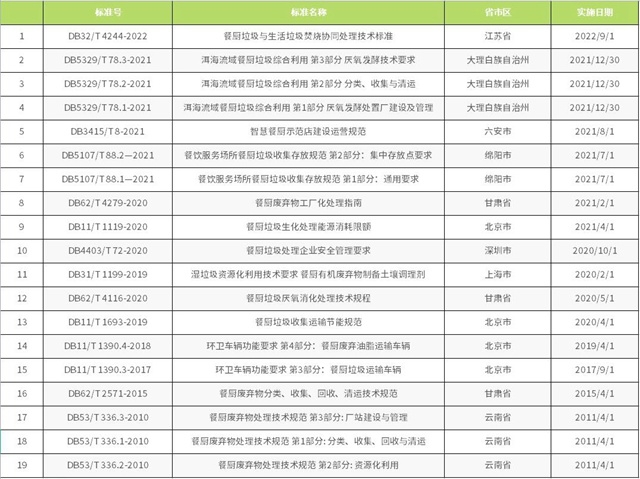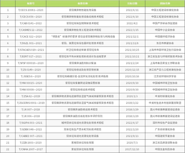 截至目前,已備案的餐廚垃圾相關(guān)標(biāo)準(zhǔn)有《餐廚垃圾車》QC/T 935-2013、《餐廚棄物處理機(jī)》JB/T 12342-2015、《餐廚廢棄物油水自動(dòng)分離設(shè)備》CJ/T 478-2015、《餐廚垃圾自動(dòng)分選系統(tǒng) 技術(shù)條件》JB/T 13166-2017、《餐廚廢棄物生產(chǎn)肥料中生物腐植酸含量測(cè)定方法》HG/T 5603-2019和《土壤調(diào)理劑及使用規(guī)程 餐廚廢物原料》NY/T 3935-2021。
