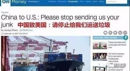 美國CNN新聞網(wǎng)站在一篇文章中這樣寫道:幾十年來,船運(yùn)集裝箱裝載著美國的廢棄物運(yùn)送到中國回收利用,這樁每年50億美元的生意,如今卻面對(duì)衰落的風(fēng)險(xiǎn)。在美國,約有15.5萬個(gè)工作崗位依賴于美國對(duì)中國的垃圾出口。